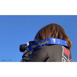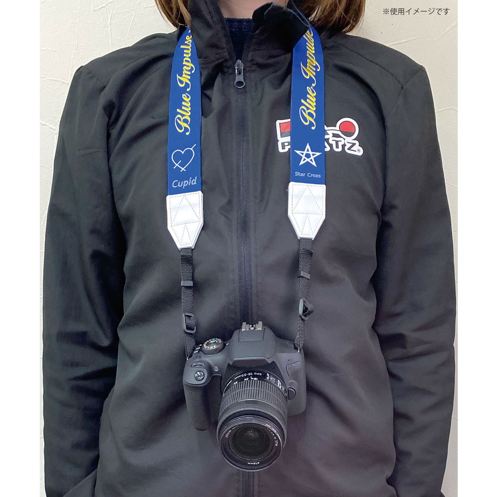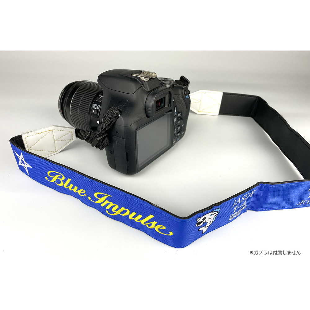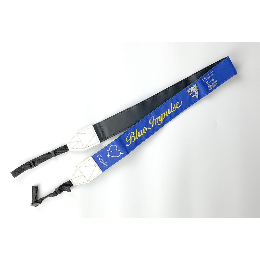 ブルーの地色にブルーインパルスのロゴマークが鮮やかなイエローで描かれたカメラストラップ。