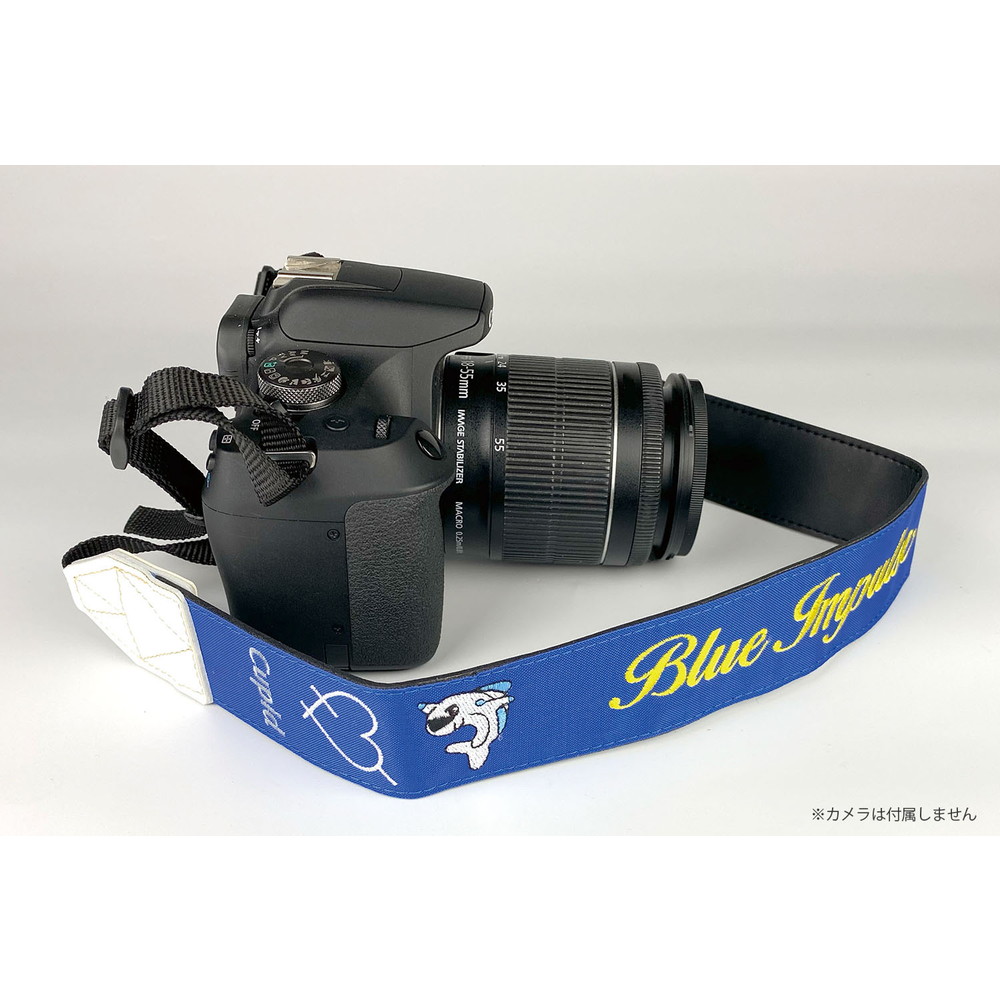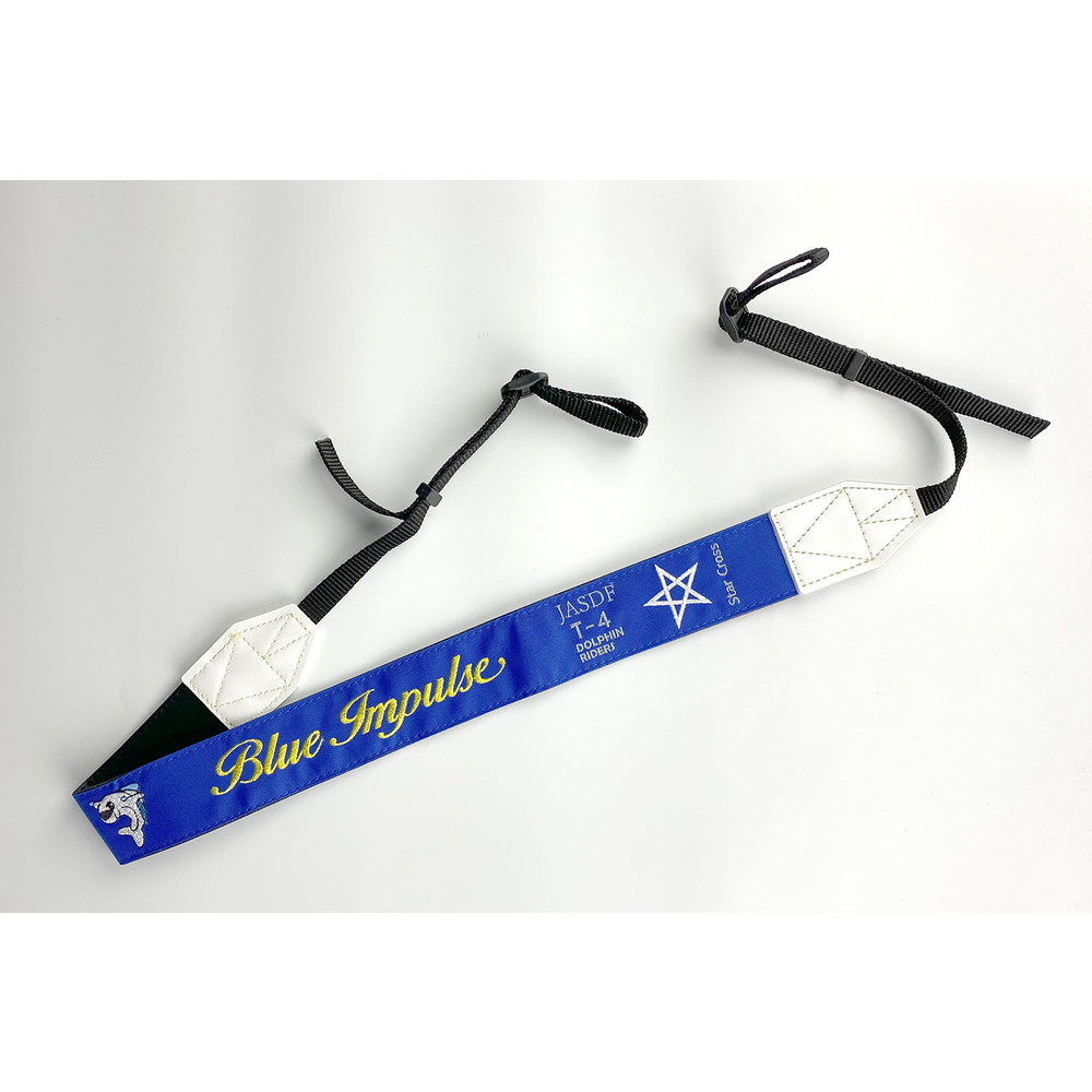 ブルーの地色にブルーインパルスのロゴマークが鮮やかなイエローで描かれたカメラストラップ。