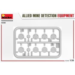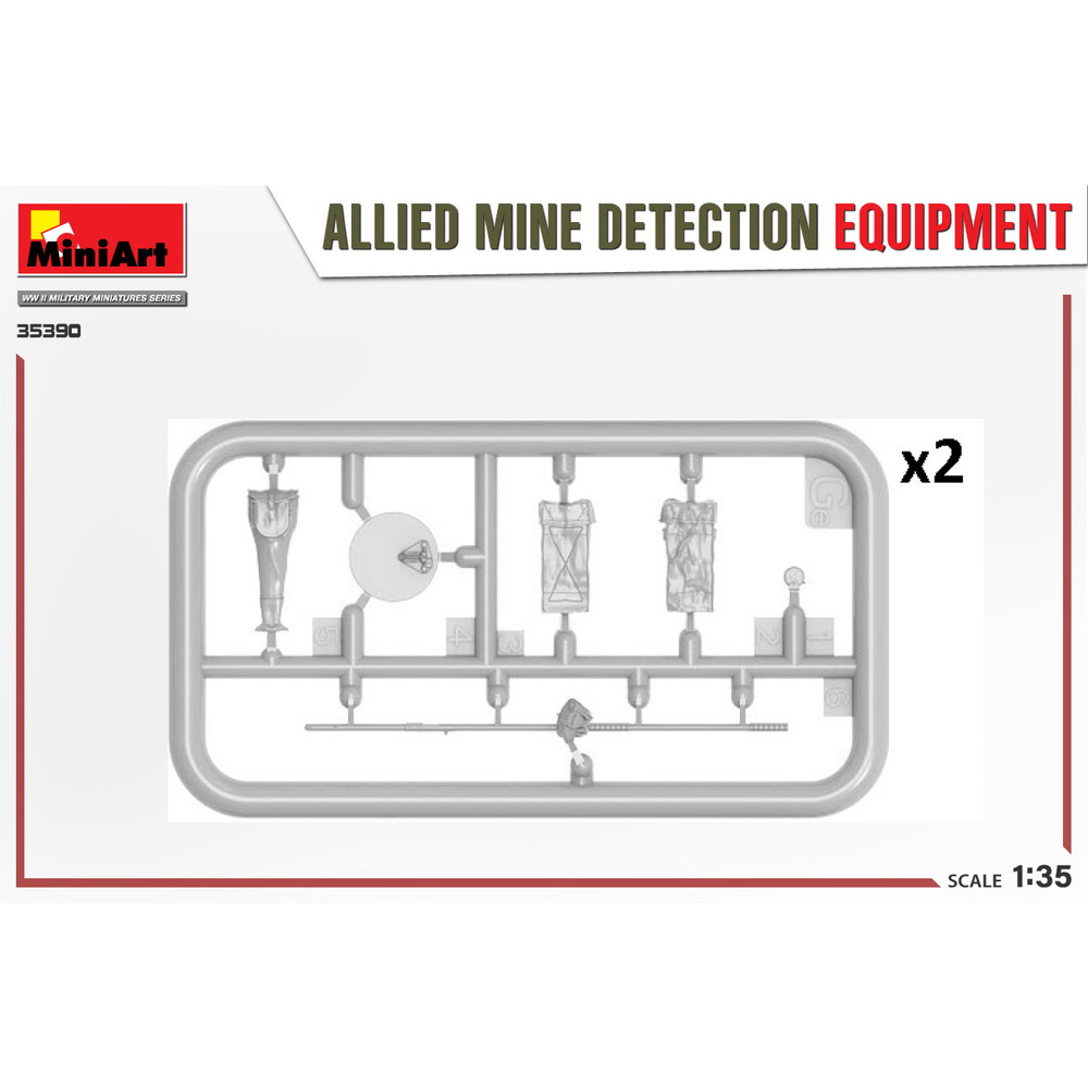 連合軍の金属探知機4種類(ソビエト、イギリス/ポーランド、アメリカ)、ドイツの地雷2種類、バッグ、マーキングフラッグ。