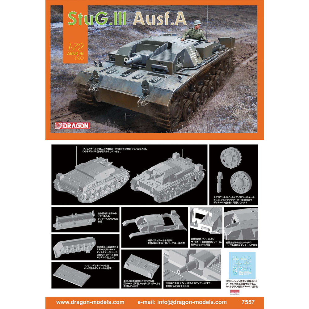 第二次世界大戦初期、バルバロッサ作戦で活躍したIII号突撃砲A型を1/72スケールで再現したプラスチックモデル組み立てキットです。