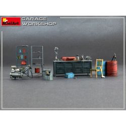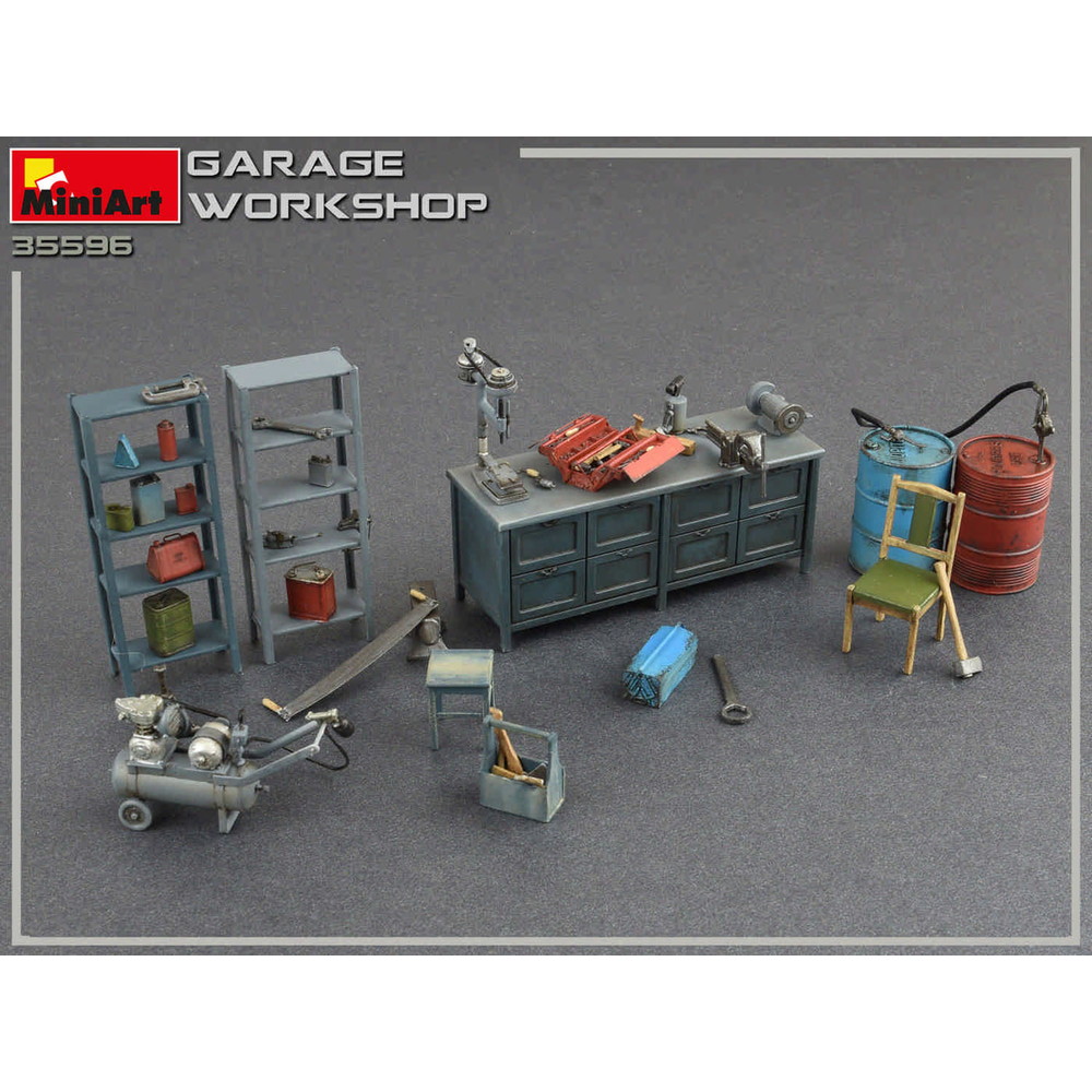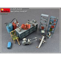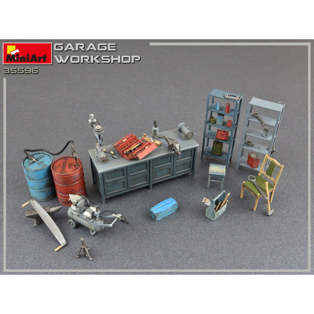 ガレージ情景に息を吹き込む・整備工場、ガレージの作業場を再現するのに必要な機材を1/35スケールで再現した組み立てキット