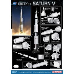歴史的偉業を成し遂げたアポロ11号の打ち上げロケット、サターンVから、司令船、サービスモジュール、および、先端に装備された打ち上げ脱出システムまでを1/72スケールで再現したプラスチックモデル組み立てキットです。