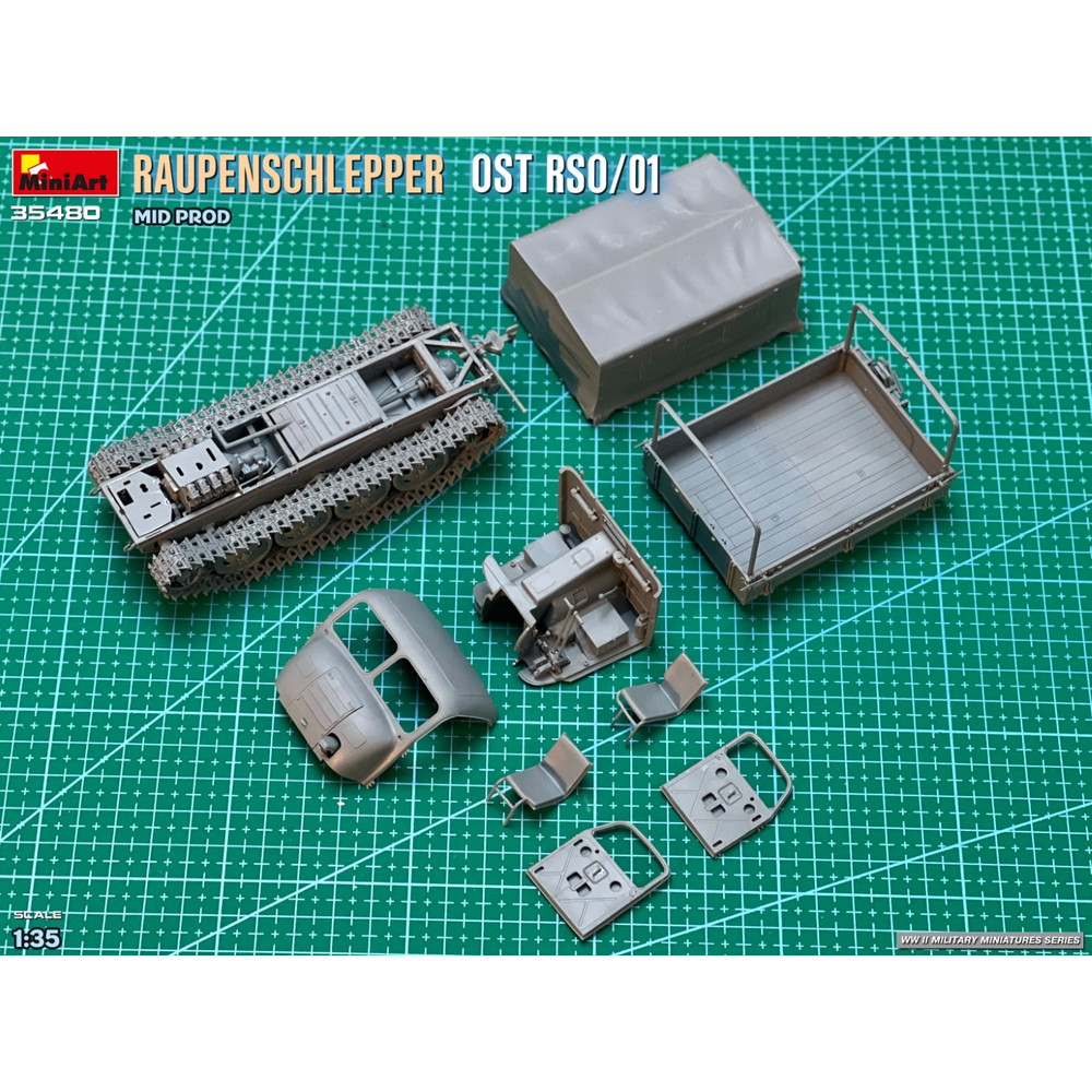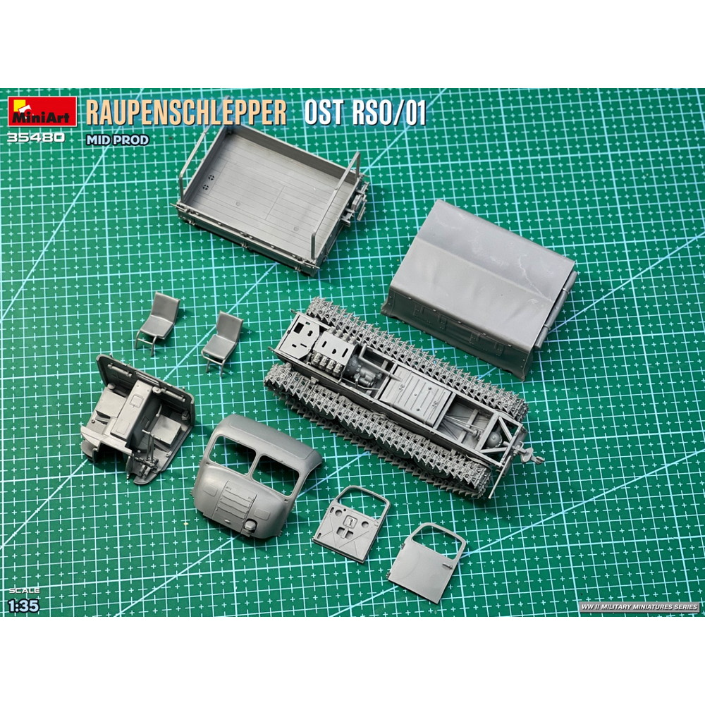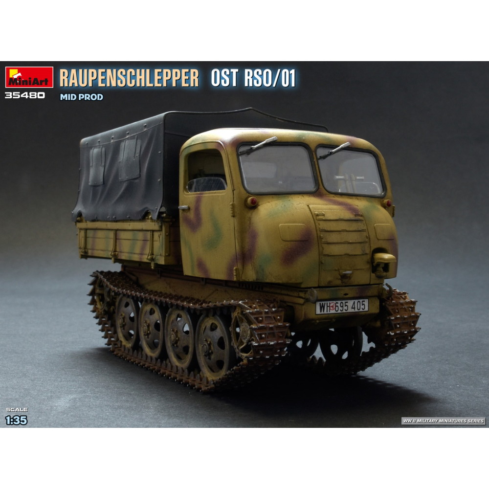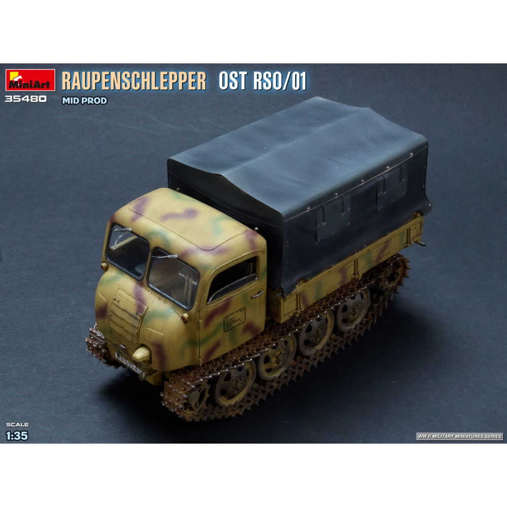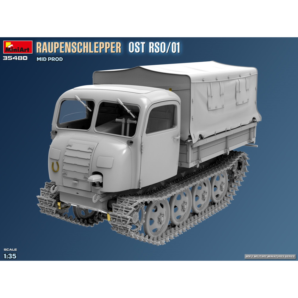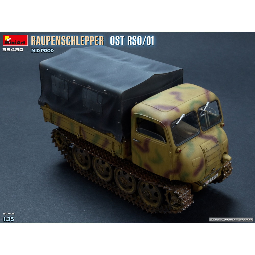 第二次世界大戦中、ドイツ軍が配備した装軌式トラクター、RSO/01の中期生産型を再現した1/35スケールのプラスチックモデル組み立てキットです。