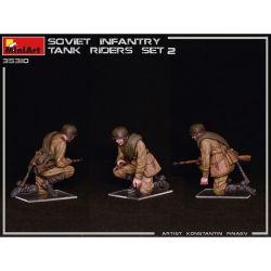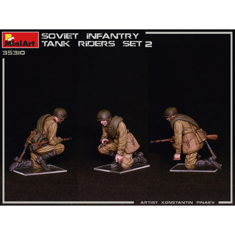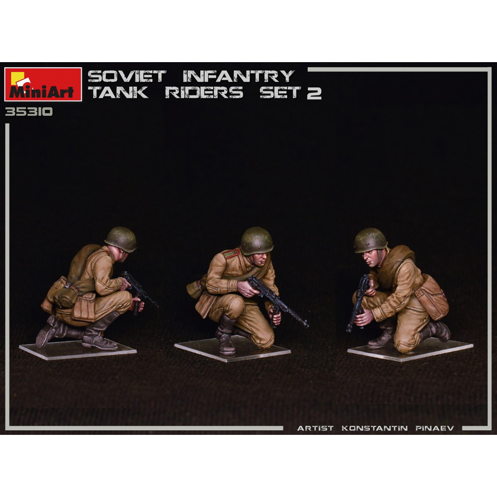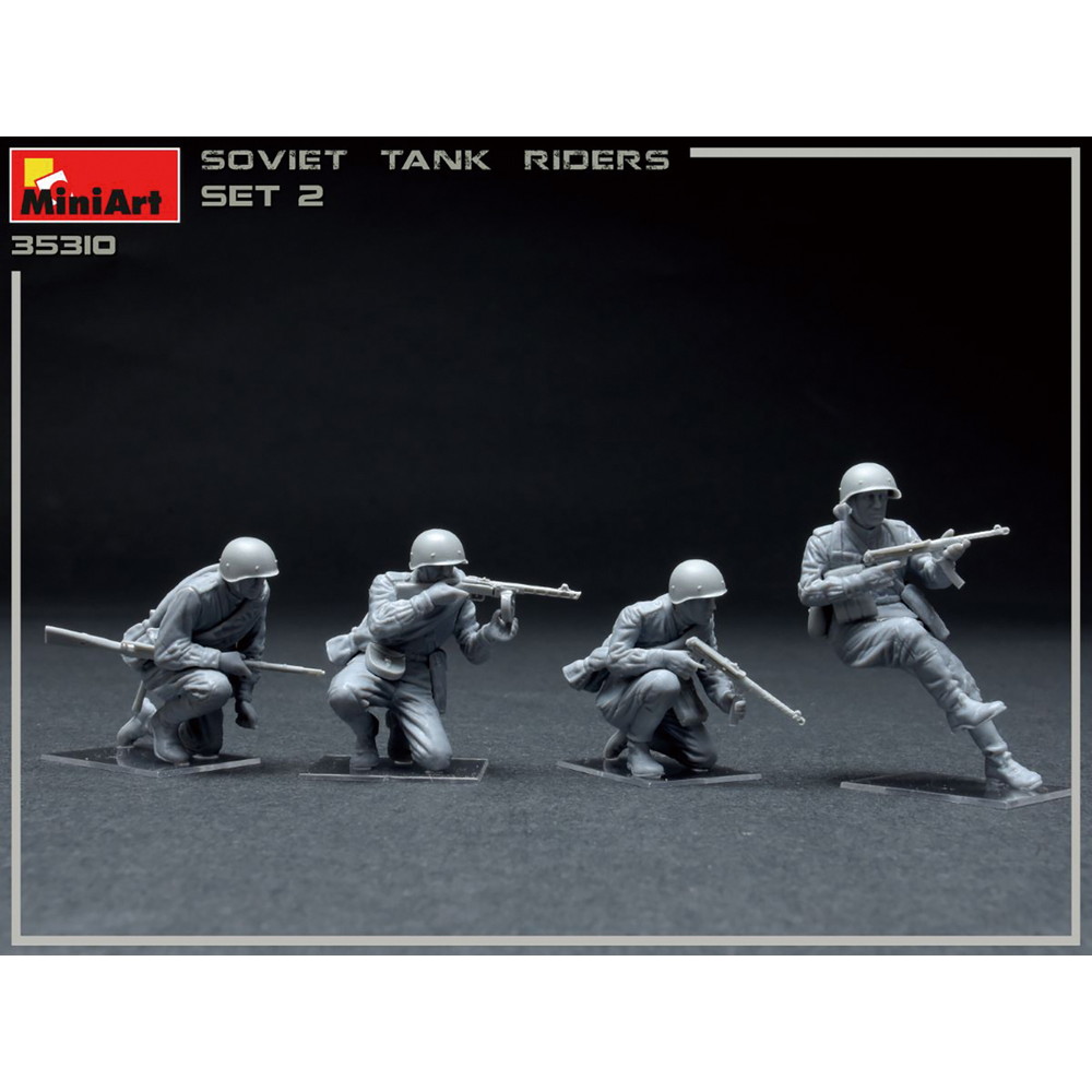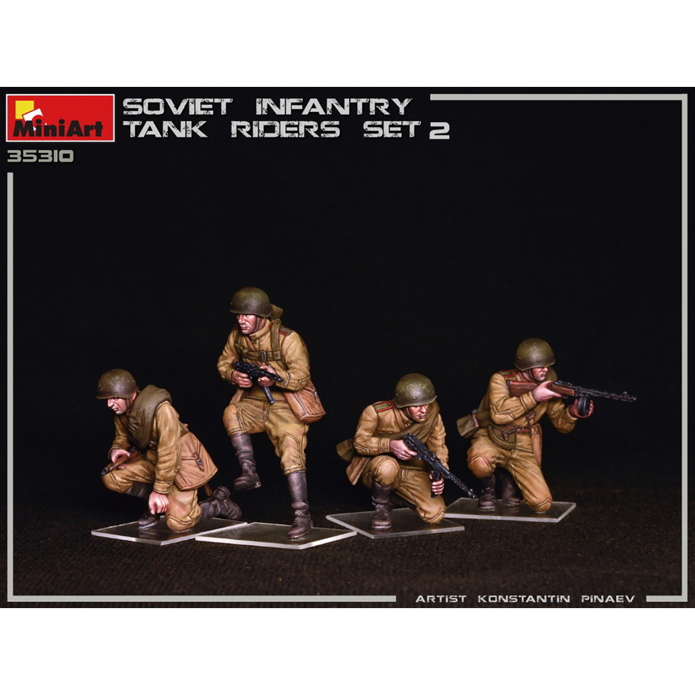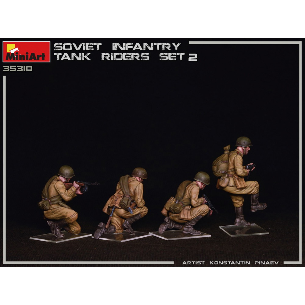 モデルは戦車の車体に乗って移動する第二次大戦のソビエト軍歩兵の姿を再現しています。スケールは1/35.前戦に進撃する緊張感あふれるポージングでモデル化したフィギュア4体セットです。
