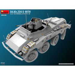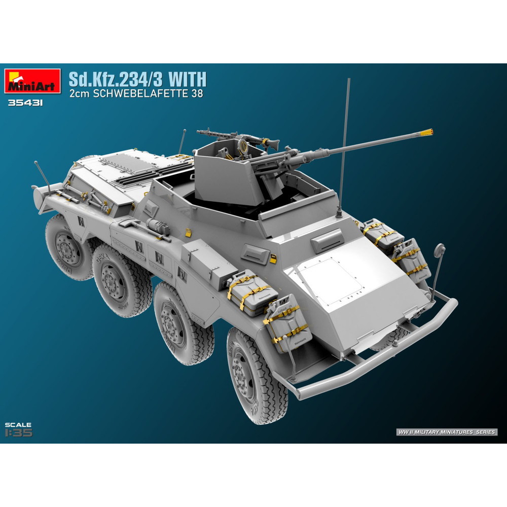 モデルは第二次大戦におけるドイツ軍のユニークな装甲偵察車、Sd.Kfz.234/3のシュヴェーべラフェッテ 2cm KwK38 搭載型を1/35スケールで再現したプラスチックモデル組み立てキットです。
