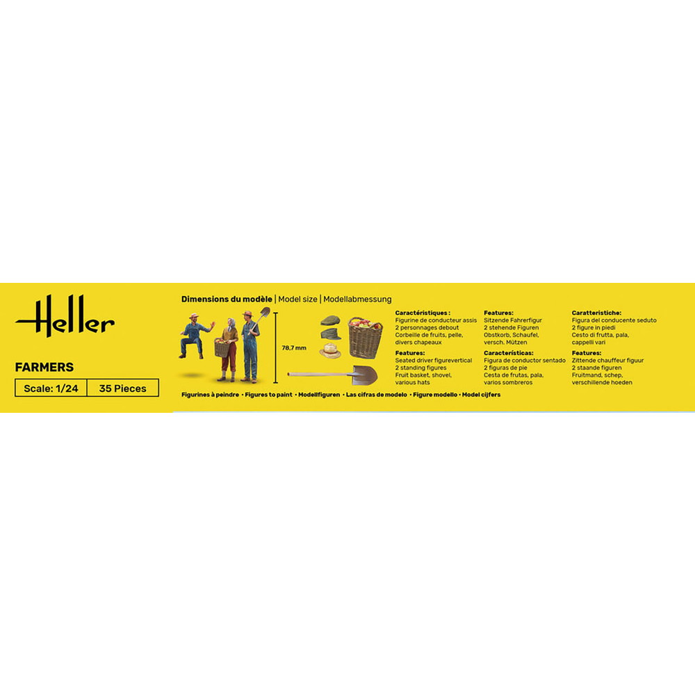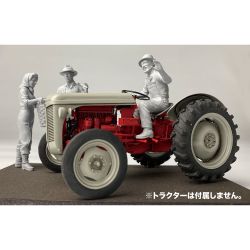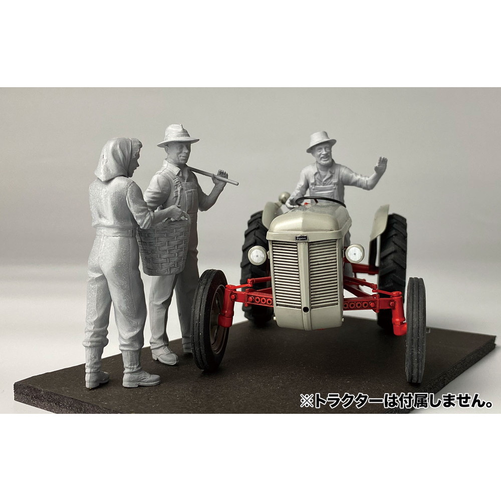 このセットには含まれませんがエレールから発売中の1/24トラクターモデルキットと組み合わせて楽しんでいただけます。そして、立ちポーズのフィギュアが男女各1体の2体。女性は収穫した作物を入れたかごを持ち、男性は農作業用のスコップを手にしたポージング。
