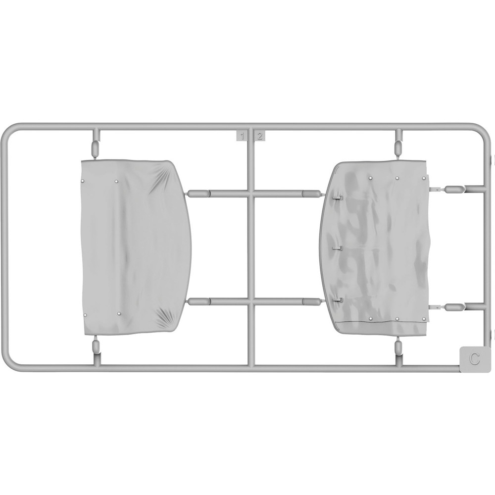 仕上がり全長168mmでキャブパーツやフロントフェンサー、ボンネットなど後期生産型の特徴をしっかりとモデル化しています。荷台部分に設置されたホロも用意されボリュームある仕上がりを演出。ホロは立てた状態だけでなくカバーを外した骨組みだけの状態やオープン状態のパーツもセット。