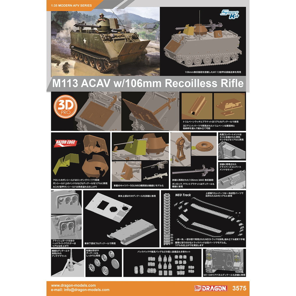 このキットでは通常のM113の車体に106mm無反動砲を搭載したタイプをモデル化しています。車体上部に設置された106mm無反動砲は本体はもちろん、マウントブラケットやガンロックパーツなども繊細に再現。車体は基本形状を正確の捉えてモデル化。フロントのトリムベーン(波切板)は3Dプリントパーツで用意され、展張時と格納時を選んで組み立て可能です。