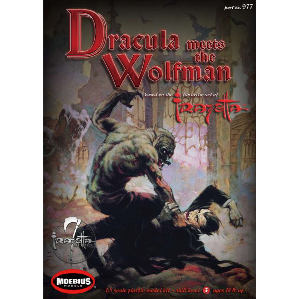 アメリカで人気のアーティスト、フランク・フラゼッタが1966年2月号のCreepy#7の表紙に描いたイラストをベースに1/8スケールで再現したドラキュラvs狼男のフィギュア組み立てキットです。
