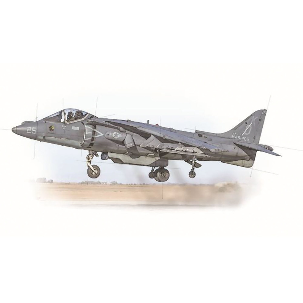 モデルはイギリスが開発、アメリカで改良され海兵隊が運用した垂直離着陸艦載機、AV-8BハリアーIIを1/72スケールで再現したプラスチックモデル組み立てキットです。