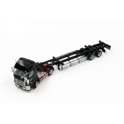 このモデルは今や世界の物流の基本となっている海上コンテナを陸上で輸送するための専用のトレーラ(黒色)を1/50スケールで再現しています。