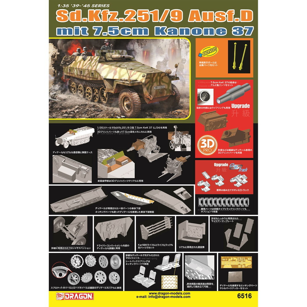 モデルは装甲兵員輸送車、Sd.Kfz.251の最終生産型、D型の車体に7.5cmを搭載したSd.Kfz.251/9 .D型 7.5cm KwK37搭載タイプを再現した1/35スケールのプラスチックモデル組み立てキットです。