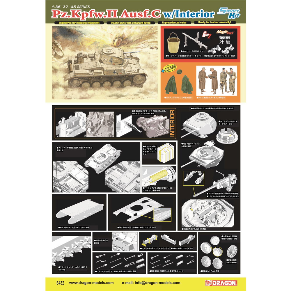 1938年から40年にかけて生産されたII号戦車のC型を、外観はもちろん車体内部インテリアまでリアルに再現した1/35スケールのプラモデル組み立てキットです。