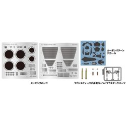 ●セットには各部のエッチングパーツ、フロントフォークの金属パーツ、さらに、カーボンパターンのデカールなどが入っています。