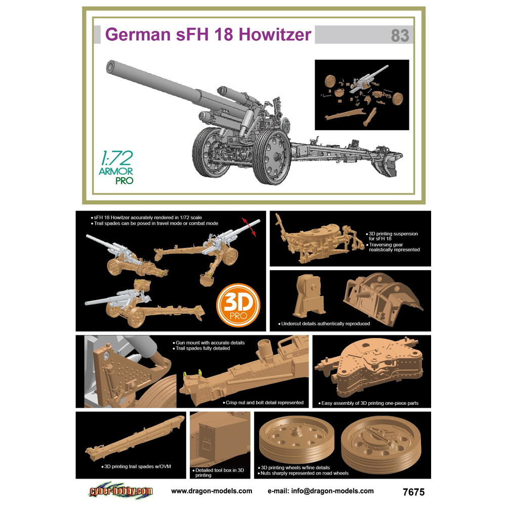 モデルはドイツ軍の主力榴弾砲、sFH18重榴弾砲を1/72スケールでリアルに再現したプラスチックモデル組み立てキットです。