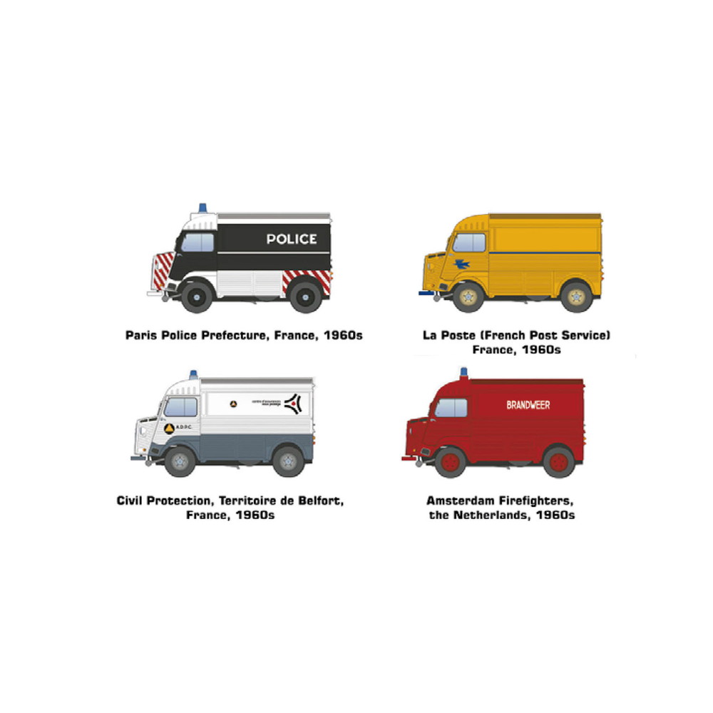 このモデルでは1960年代フランスの警察車両、郵便車両、市民保護活動車両、さらに、オランダのアムステルダム消防署車両の4種類のマーキングをセット。