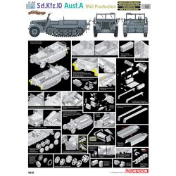 前輪にタイヤ、リヤに履帯を装着したハーフトラックは優れた不整地での走破能力から機動力を生かしたドイツ軍に多数が配備されました。Sd.Kfz.10は牽引力1トンのハーフトラックで、戦前から1944年まで約20000輌が生産されています。第二次大戦のドイツ軍車両の中でももっとも生産数の多い車両のひとつで、本来の用途である火砲牽引や兵員輸送に活躍したほか、対空砲や対戦車砲を搭載した自走砲も生産されています。