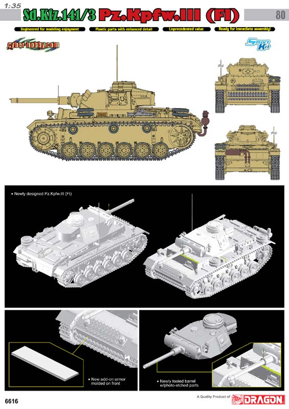 これまでもサイバーホビー オレンジボックスで同じアイテムがありましたが、今回の新製品はスマートキット版のIII号戦車M型をベースとしており、組立て易さと再限度が大幅に向上しました。