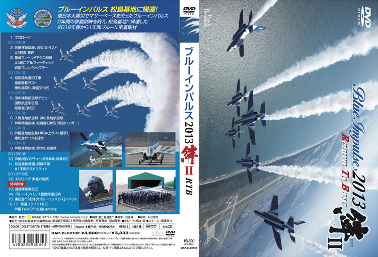 2013年3月末に松島基地に帰還したブルーインパルス。 移動訓練の間ブルーインパルスはいったいどうしていたのだろうか。 2012年12月発売のDVD「絆」では震災から築城基地航空祭でのフルアクロ復活までを克明に収録しましたが、絆 II は2012年春から松島基地に帰還までの約1年間、ブルーに密着取材したドキュメンタリーです。
