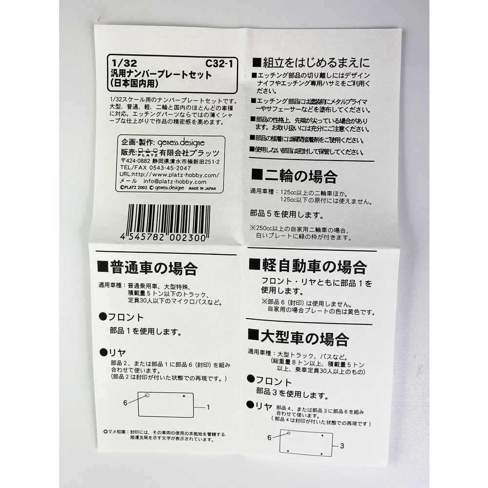 License plate parts for 1/32scale carmodels and bikemodels.- This plate can be attached to most of models of cars ,large cars,motorcycles,and minicars.